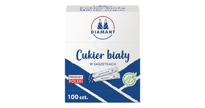 Cukier biały Diamant w saszetkach, 100 sztuk po 5 g każda – idealny do słodzenia napojów w biurze.