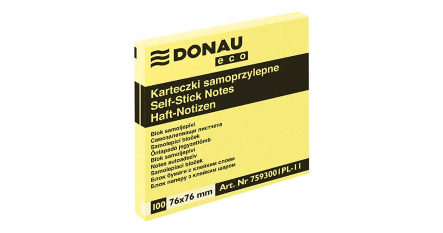 Blocz samoprzylepny Donau ECO, rozmiar 76x76 mm – ekologiczne rozwiązanie do notatek i organizacji dokumentów w biurze.