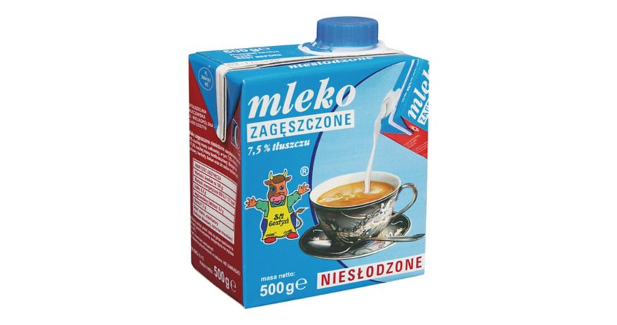 Mleko skondensowane niesłodzone marki Gostyn, opakowanie 500 g – idealne do kulinarnych zastosowań w biurze.