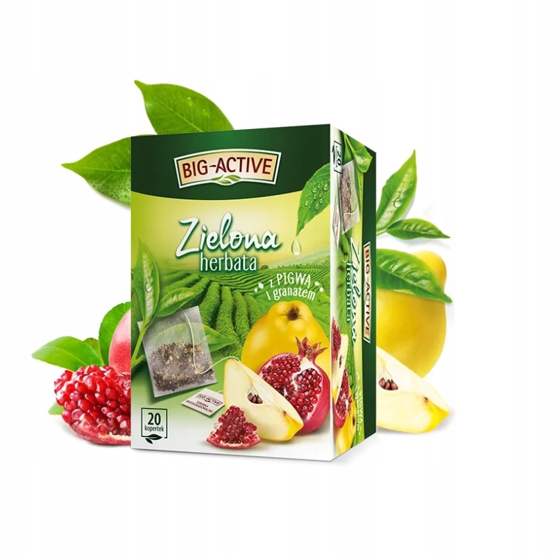 Herbata zielona Big-Active o smaku pigwy i granatu, opakowanie 20 kopert – zdrowy i orzeźwiający napar do biura.