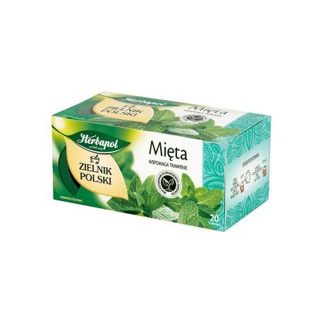 Herbata ziołowa Herbapol Mięta, opakowanie 20 torebek – orzeźwiający napar idealny do przerw kawowych w biurze.