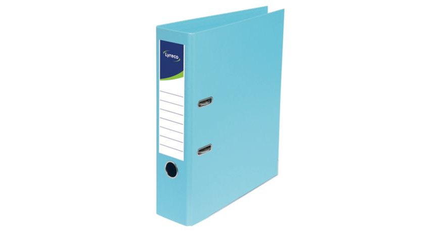 Segregator z mechanizmem pierścieniowym marki Lyreco, wykonany z polipropylenu, format A4, szerokość 50 mm, kolor błękitny.