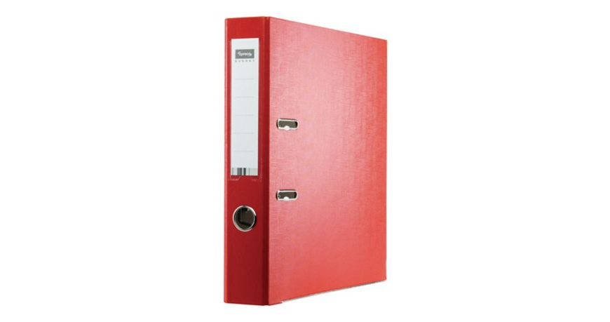 Segregator z mechanizmem pierścieniowym marki Lyreco, wykonany z polipropylenu, format A4, szerokość 50 mm, kolor czerwony.