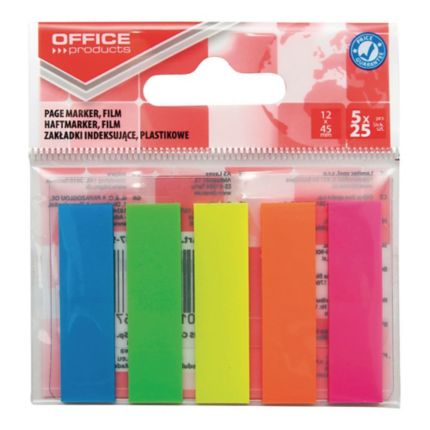 Zakładki indeksujące Office Products, 12x45 mm, mix kolorów, 5 szt. – samoprzylepne i wielokrotnego użytku, idealne do zaznaczania dokumentów.