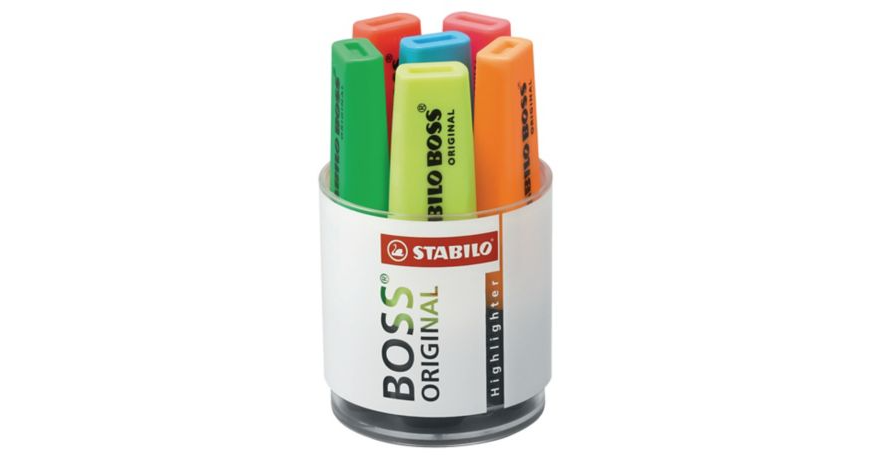 Zakreślacz Stabilo Boss Original, zestaw 6 kolorów w wygodnym kubku, zapewnia różnorodność w oznaczaniu tekstów.